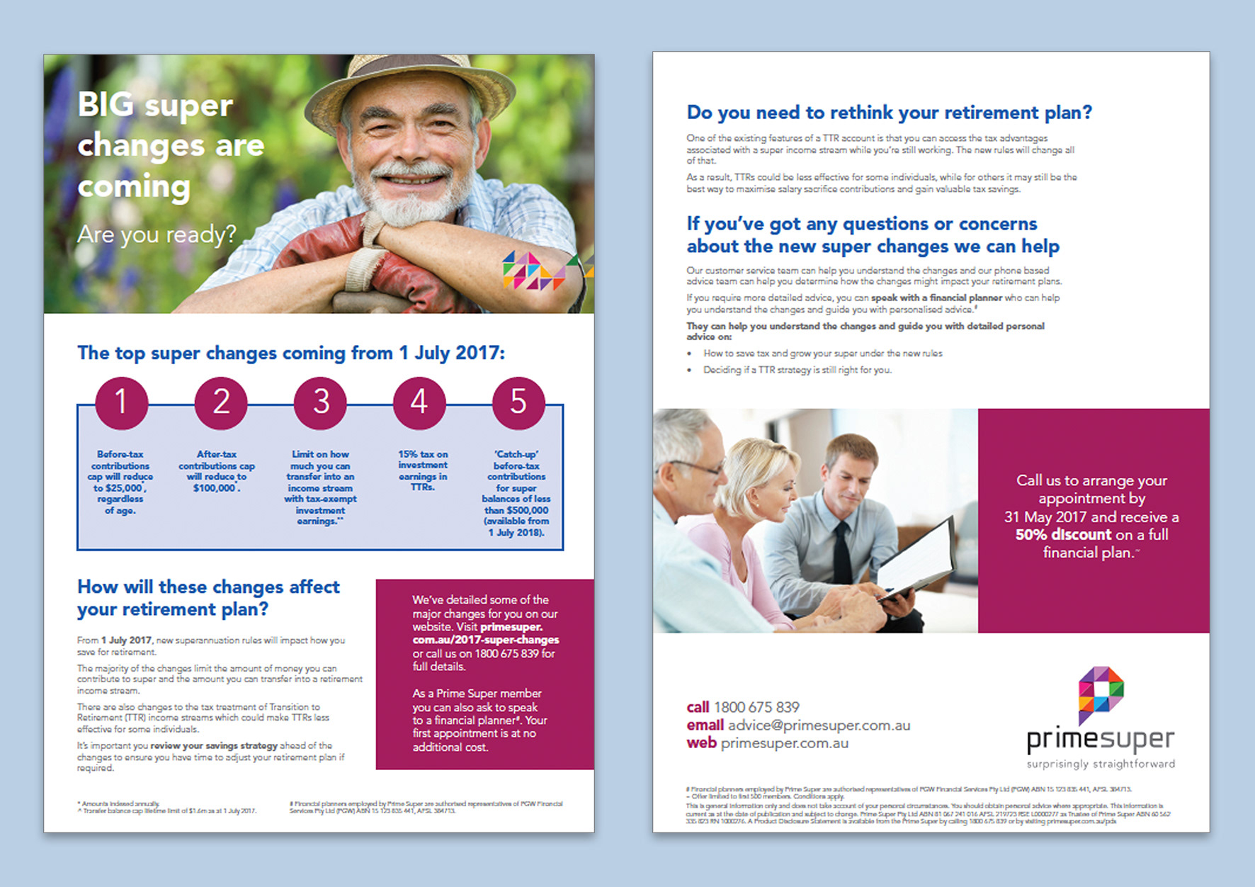 In-house design for superannuation fund Prime Super, keeping to existing brand guidelines. Material created included eDMs and web content, annual statements, icons, lengthy pitch documents, promotional print material, advertisements and more. A small selection of examples below.